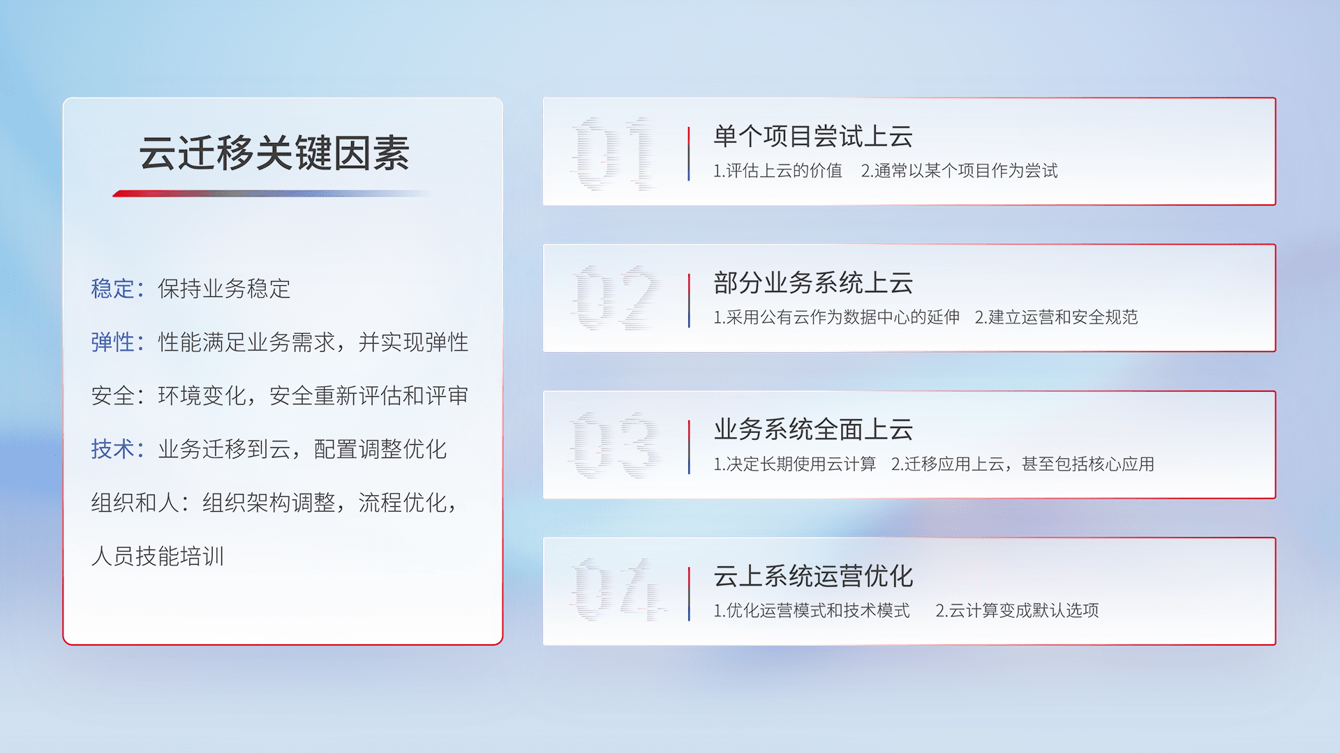 结合实际业务,,从规划设计、、、、云平台选型、、、、云原生改造、、数据迁移、、集成交付,,迁移全过程为客户识别最佳上云路径,,做好风险识别管理,,,设计网络架构、、、、身份权限、、安全审计合规、、、、操作审计、、、日志审计、、监控告警策略、、、多站点容灾设计等,,,,对云上基础设施进行整体规划,,,提升IT治理水平,,以满足弹性、、、、高可用、、高性能的需求。。