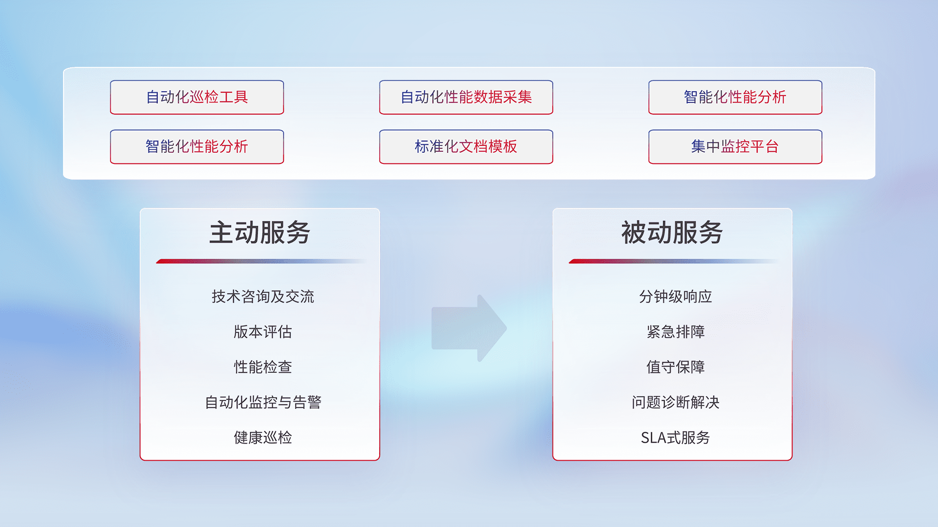 智能化工具和标准化文档,,,,保障服务质量,,提供主动服务(包含技术咨询、、版本评估、、性能检查、、、、自动化监控与告警、、、健康巡检)和被动服务包含(分钟级响应、、、、紧急排障、、、、值守保障、、、问题诊断解决、、、SLA服务)。。。。