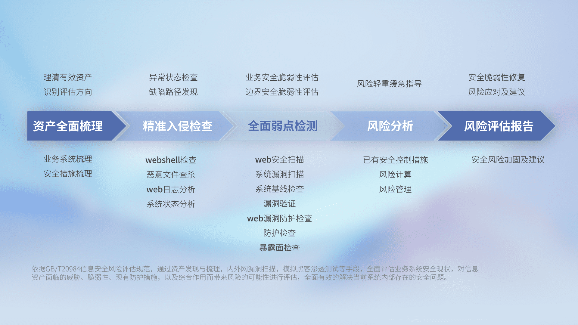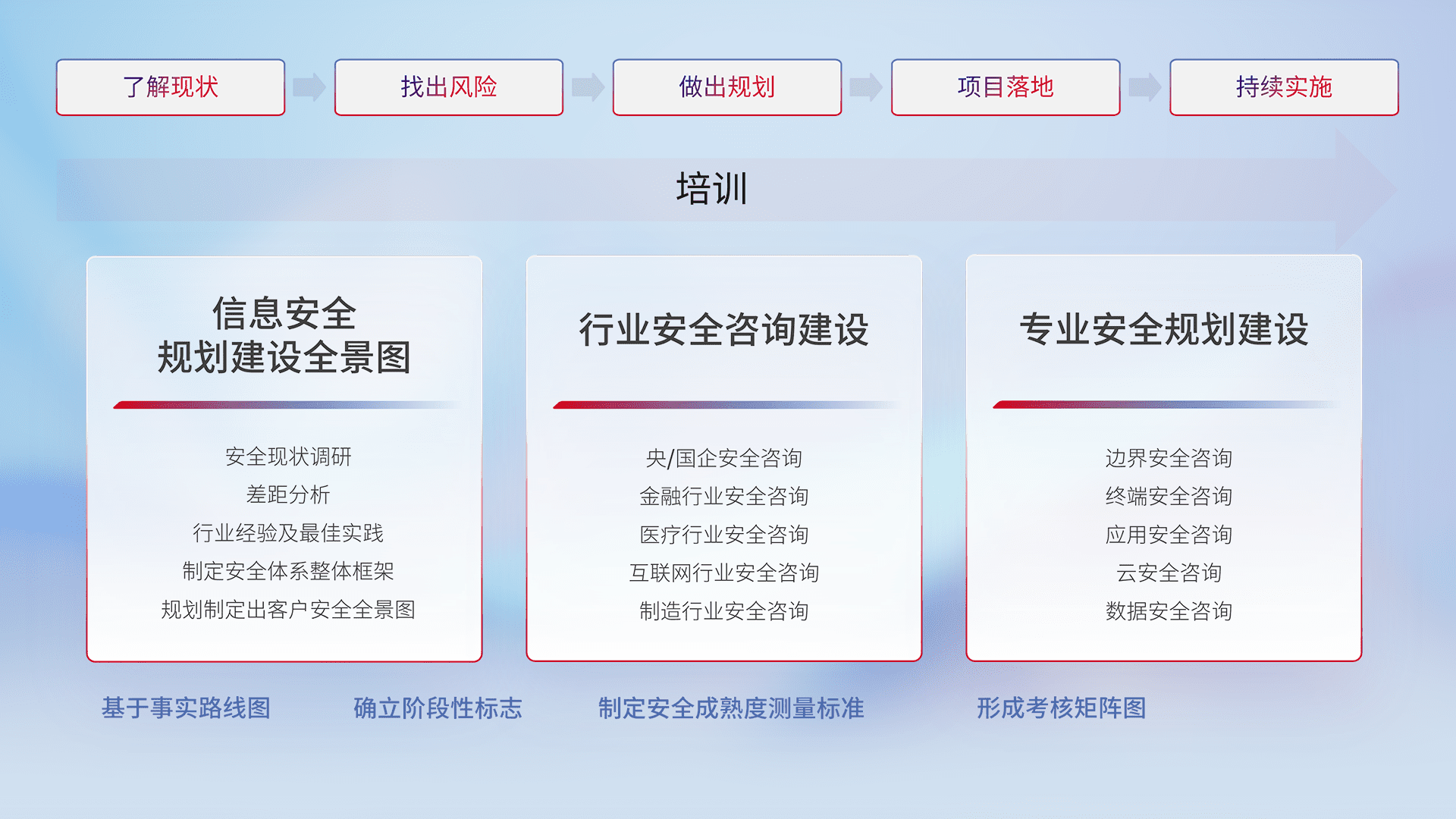 针对客户行业特性,,以专业的安全服务+多厂商联合解决方案提供专属的一站式安全管理服务,,,帮助客户全面感知网络空间威胁,,基于识别、、、检测、、、分析、、、防护、、、监测、、响应的服务理论模型,,从方案咨询、、、集成交付、、评估验证、、、、优化加固、、、运维运营,,,致力于为客户提供完整的闭环管理式安全服务。。以实战经验为客户打造高抵御风险的安全体系,,帮助客户发现威胁、、对抗威胁、、、处置威胁,,,不断积累安全对抗能力,,,持续保障数字化安全。。